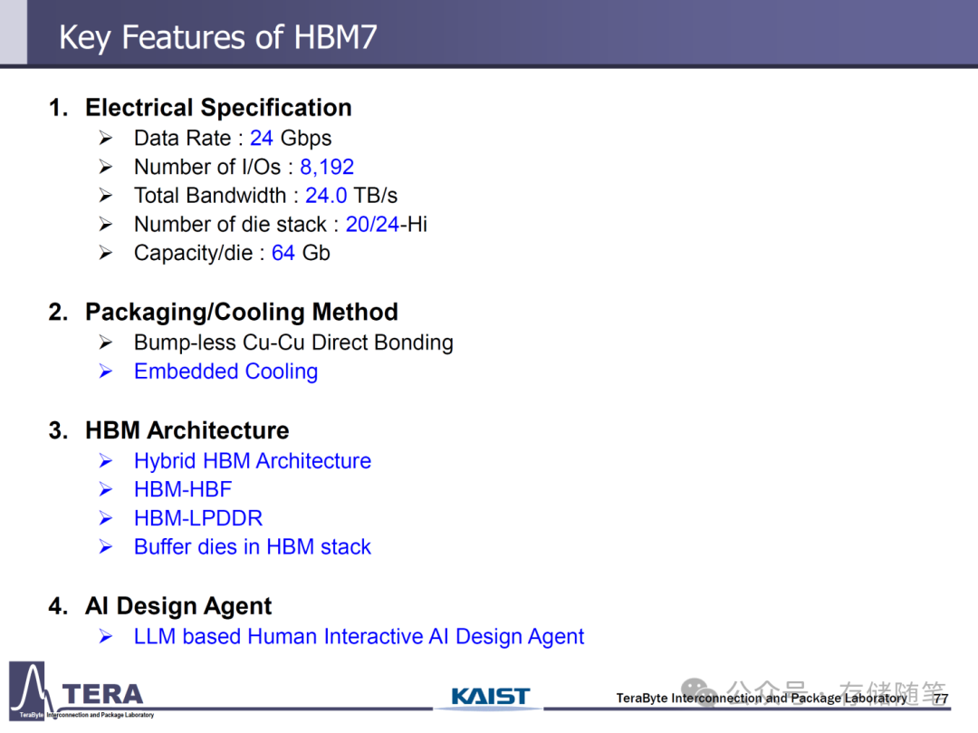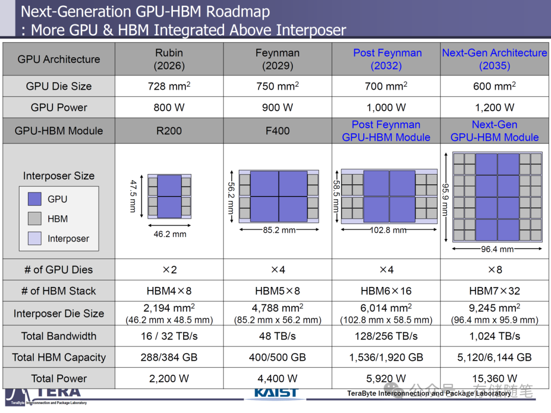 HBM7的封装将采用无凸点铜 - 铜直接键合技术,并引入嵌入式冷却解决方案。此外,HBM7还将推出全新的HBM - HBF(High - Bandwidth Flash)和HBM - 3D LPDDR架构,以进一步提升内存性能。基于HBM7的下一代解决方案将采用超级大尺寸和多芯片设计,单个封装将包含8个GPU位点,每个GPU尺寸为600平方毫米,功耗1200W,32个HBM7存储体将提供1024TB/s的带宽,成为首个达到Exabyte级带宽的解决方案。芯片的内存容量将高达5120 - 6144GB,总功耗15360W。