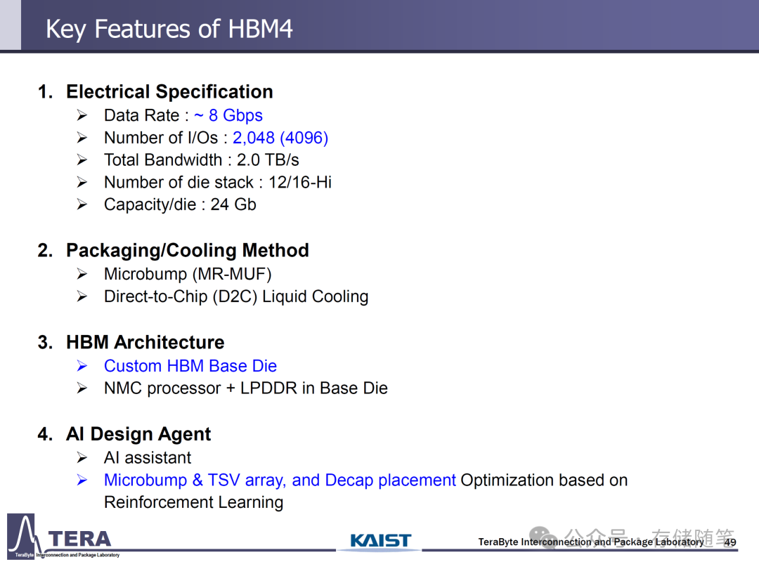 HBM4标准的主要技术指标令人瞩目:数据传输速率约8Gbps,拥有2048个I/O接口(部分配置可达4096个),单堆栈带宽2.0TB/s,支持12层或16层堆栈,每层裸片容量24Gb,使得每个HBM4模块的容量可达36GB(12层堆栈)或48GB(16层堆栈),每个HBM4模块的功耗为75W。在封装方面,采用Microbump(MR - MUF)技术,并配备直接芯片冷却(D2C)液冷系统。同时,HBM4还采用了定制的基础裸片架构,集成了NMC处理器和LPDDR内存。