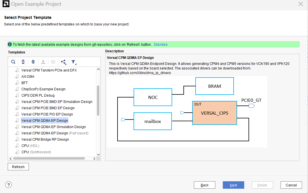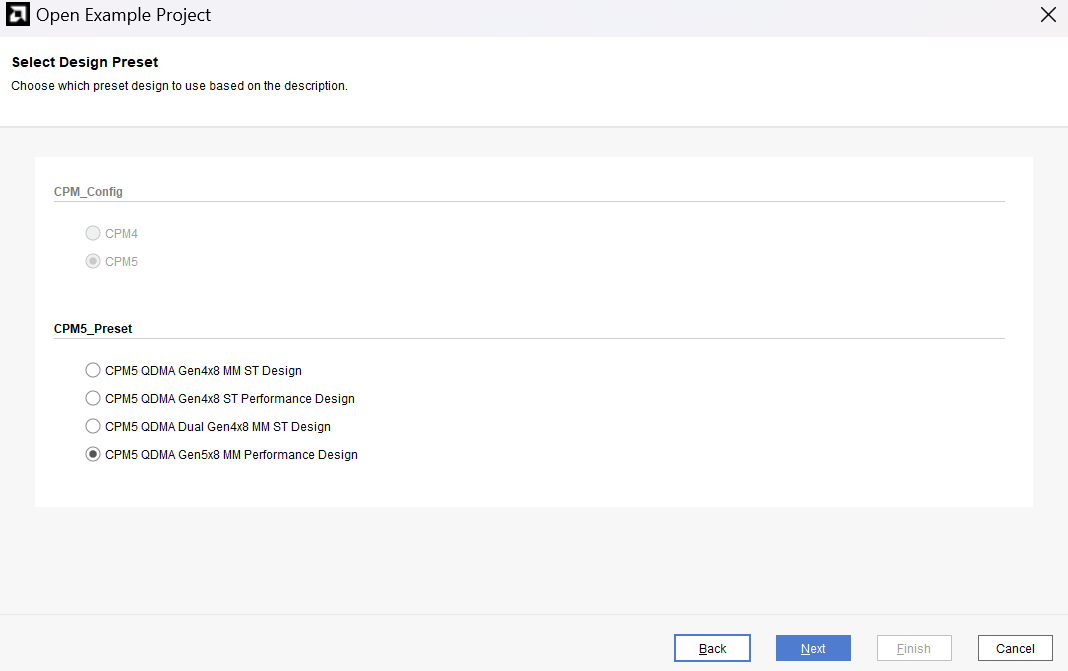 打开CPM5 QDMA Gen5x8 MM Performance Design,然后finish即可