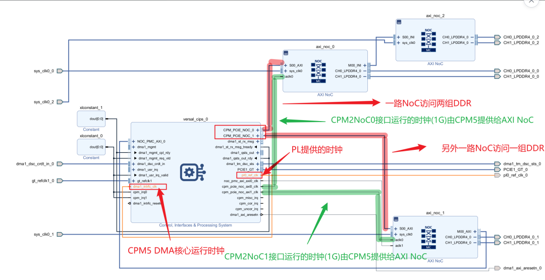 可以看到从CIPS IP中出现两个CPM_PCIE_NOC口去访问两边的DDR: