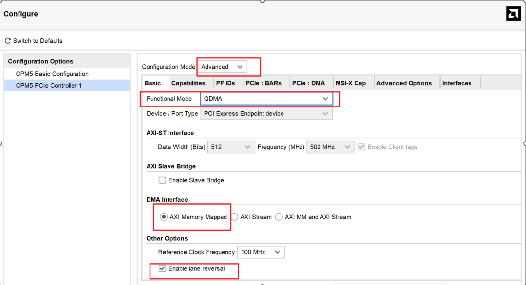选择QDMA模式下的AXI MM,根据硬件结构选择Lane翻转。