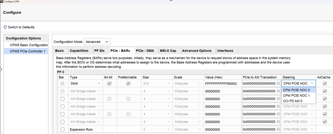 转向器选择:这里默认只选择CPM2NoC0,这个后续通过Host profile来指定使用两个CPM2NoC接口