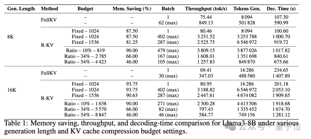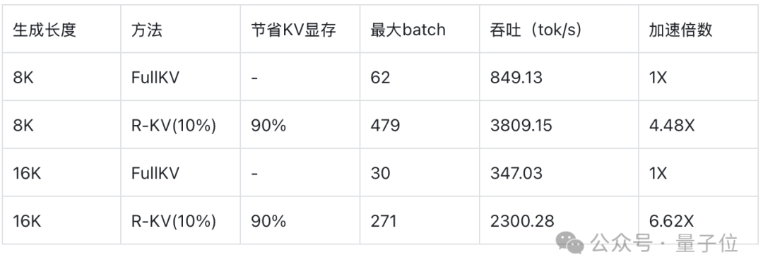 然而,这种直接的速度提升仅占整体收益的一小部分,R-KV带来的主要吞吐量提升来自于KV缓存压缩,使模型能够支持显著更大的推理批处理大小。