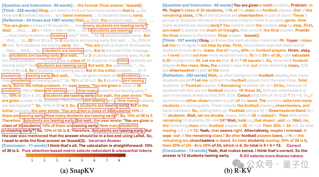 上图展示了R-KV和纯注意力基线SnapKV在相同解码步骤中选择了哪些token。灰色=未选;由浅到深红=被越多注意力头选中。