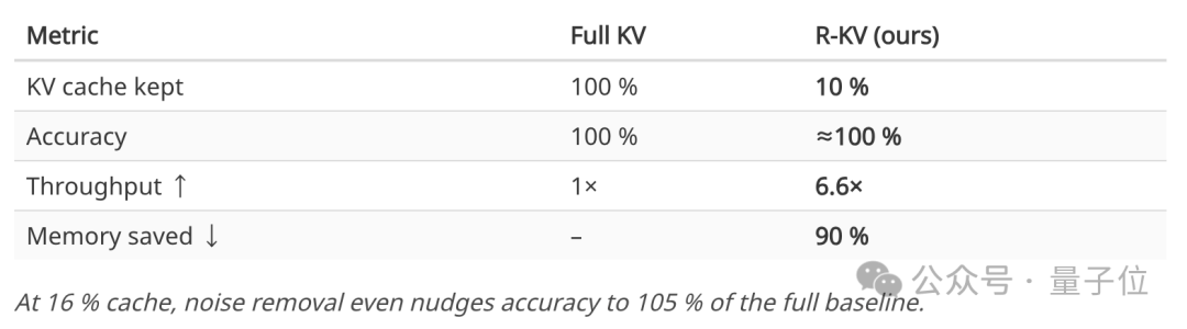 R-KV开源登场:显存↓90%、吞吐×6.6、准确率=100%。