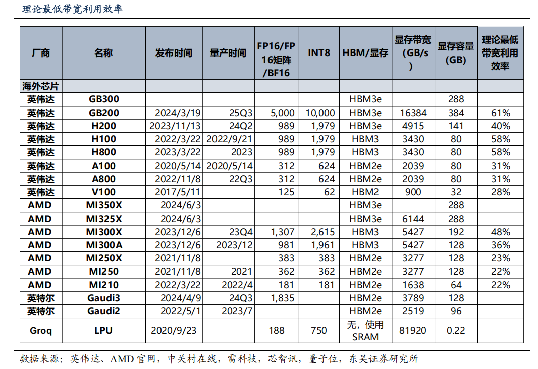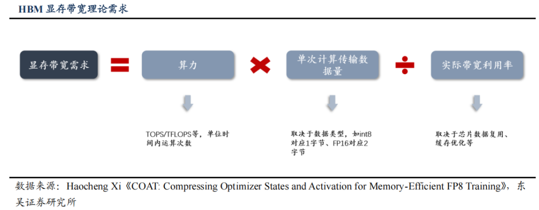 因此,AI 芯片所需 HBM 显存带宽主要受到两个变量影响:1)芯片所能达到的算力峰值,与所需带宽成正比;2)芯片数据复用、缓存优化情况,与所需带宽成反比。