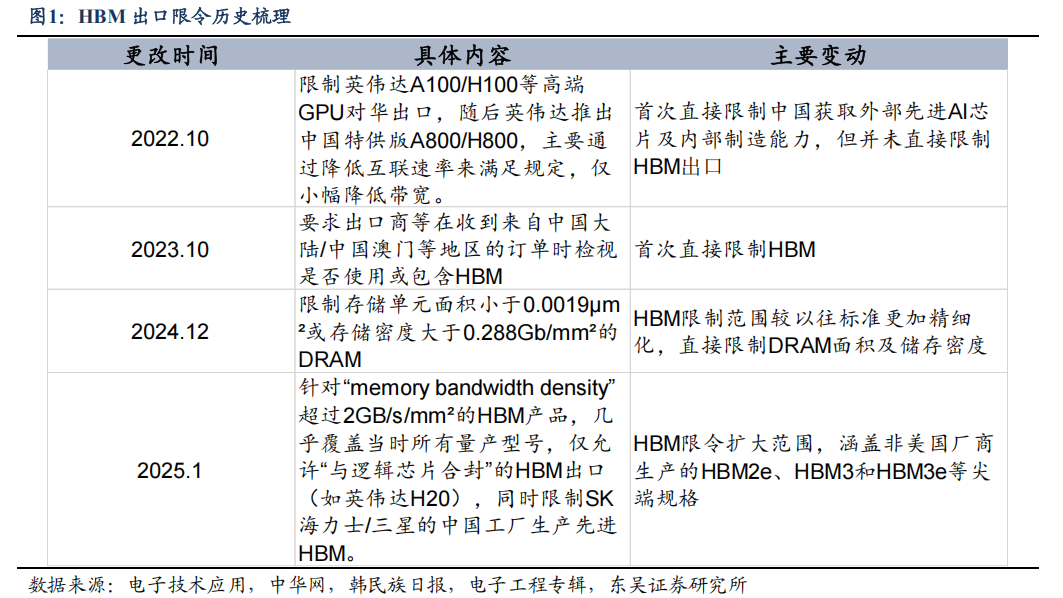 2024年 12月,美国进一步修订管制条例,将技术参数从传统的技术节点(nm)细化升级,限制存储单元面积小于 0.0019µm²或存储密度大于 0.288Gb/mm²的 DRAM,从而控制本身就是多个DRAM 通过 TSV 工艺堆叠封装的 HBM。2025 年 1 月,美国发布新一轮禁令,涵盖HBM2e、HBM3、HBM3e等尖端规格,基本封锁了中国获取最新 HBM 技术的渠道,同时加强供应链管控,限制使用美国技术的海外企业(如三星、SK 海力士)向中国供货。