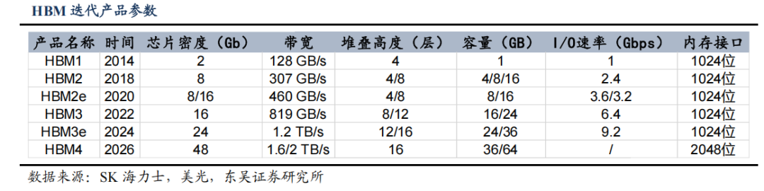 海外旗舰 AI 芯片普遍配置最新 HBM3e,算力快速增长驱动 HBM 代际升级,带来带宽跃升。以英伟达旗舰产品 GB200 为例,其采用 HBM3e 显存,实现 16384 GB/s 的超高带宽和 384GB 容量,较 H100(HBM3 3430 GB/s)带宽提升近 4 倍,容量增加 3.8倍,下一代 GB300 预计将延续这一技术路线。类似地,AMD MI350X 也搭载 HBM3e,其 6144 GB/s 带宽较前代 MI300X(HBM3,5427 GB/s)提升显著。带宽的跃升式发展在历代 HBM 产品对比中更为明显:从 HBM2(如 V100 的 900 GB/s)到 HBM2e(A100的 2039 GB/s),再到 HBM3/HBM3e,每代技术迭代都带来 50%-100%的带宽提升,从HBM2 的 1000 GB/s 左右大幅跃升至 HBM3e 的 5000 GB/s 以上;显存容量也从 HBM2时代的 32-80GB 大幅提升至 HBM3e 时代的 288-384GB,更好地满足了 LLM 等内存密集型应用需求。AI 芯片算力增长推动 HBM 配置不断升级迭代,通过高多层堆叠等技术创新,在单位面积带宽密度上实现突破,从而带来整体 HBM 带宽的跃升。