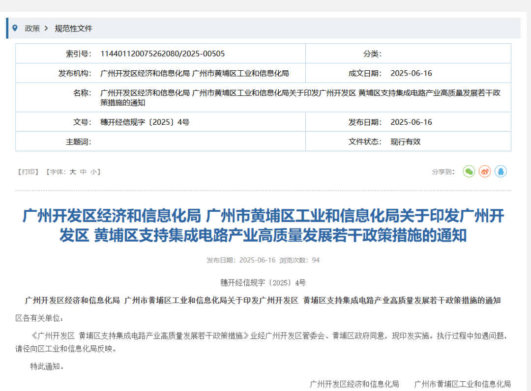 6月16日,广州开发区经济和信息化局、广州市黄埔区工业和信息化局联合印发《广州开发区黄埔区支持集成电路产业高质量发展若干政策措施》,旨在加快推动区域集成电路产业高质量发展,打造中国集成电路产业第三极核心承载区。