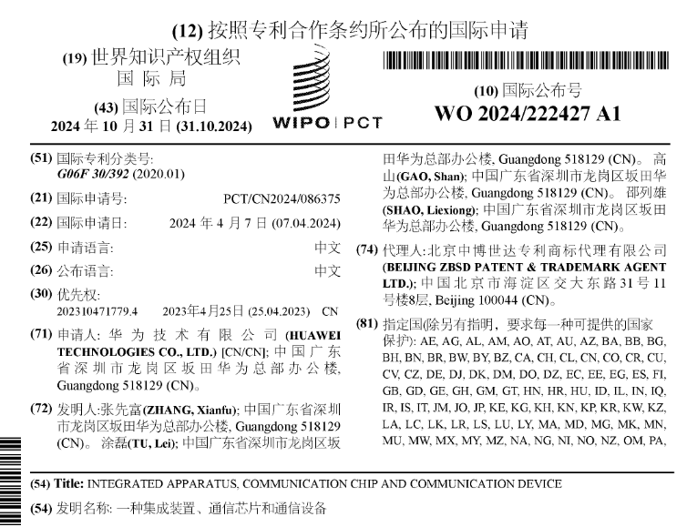 根据国家知识产权局公开信息,华为于2024年4月提交的“一种集成装置、通信芯片和通信设备”专利(国际申请号PCT/CN2024/086375)已进入实质审查阶段。华为提交的这项专利采用的是类似于晶圆上基片本地封装 (Chip on Wafer on Substrate-Local,CoWoS-L)桥接的技术方案,而非简单的中介层(Interposer)结构,专利描述了一种基于硅中介层的四芯片堆叠方案,通过垂直互连技术实现芯片间超高速数据传输,单封装内可集成四颗计算芯片。