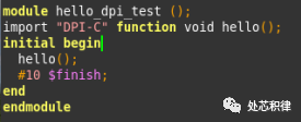 为了更加简洁的连接C,system verilog 引入了DPI(Direct Programming Interface)。只要使用import声明和使用,导入一个C子程序,就可以像调用System Verilog中的子程序一样来调用它。相反,如果C想用system verilog里面的函数用export 声明即可。下面是一个简单的例子。