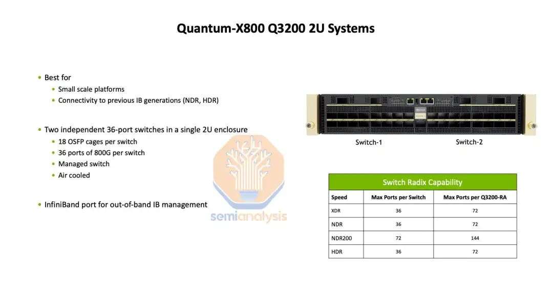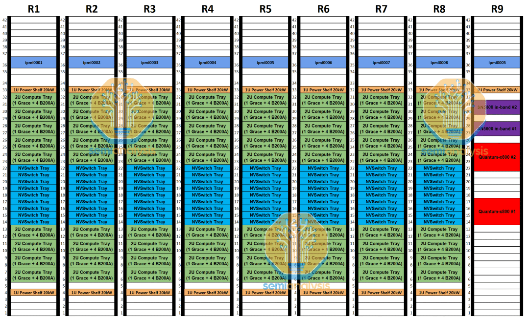 在后端网络上,由于每个计算托盘只有两个 800G 端口,我们认为它将使用 2 轨优化的行端网络。每 8 个 GB200A NVl36 机架将配备 2 台 Quantum-X800 QM3400 交换机。