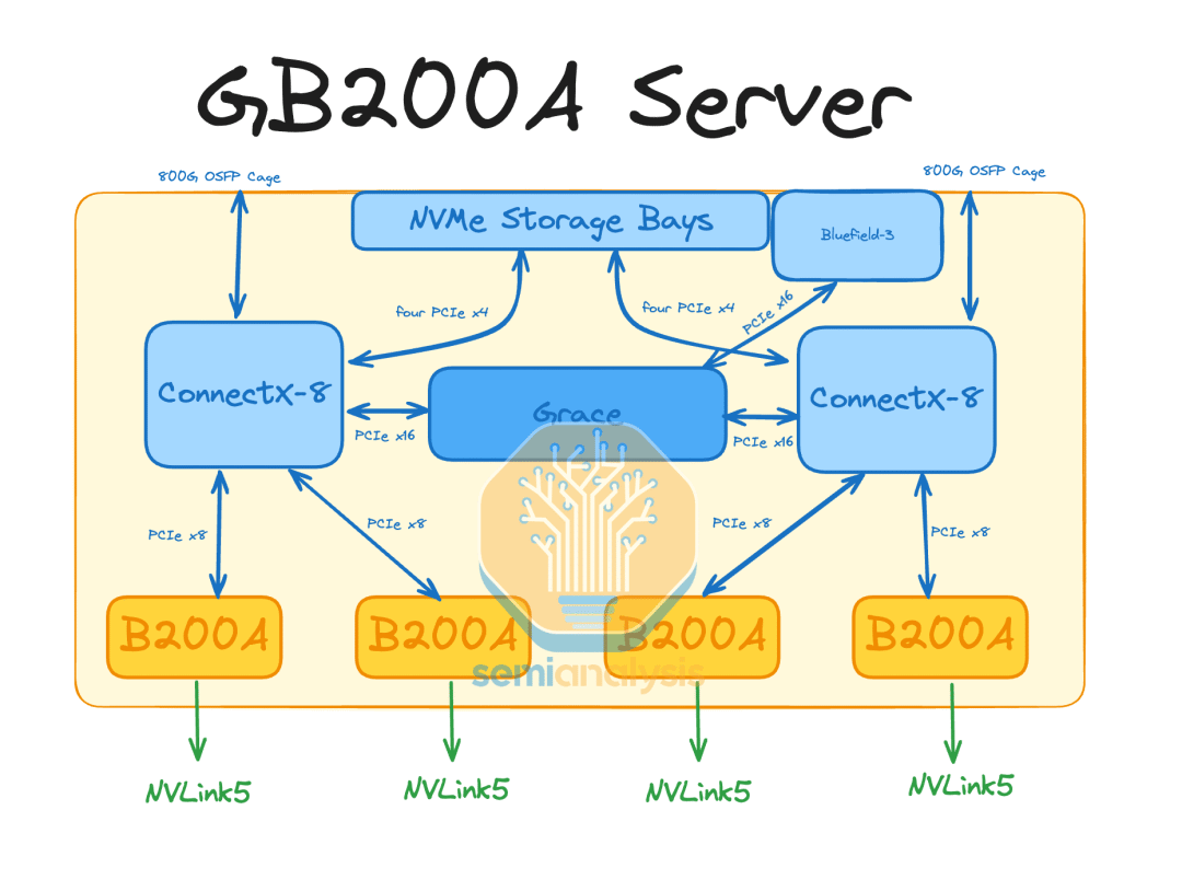 由于Grace CPU 和Blackwell GPU 位于不同的印制电路板上,我们认为可能也会有 x86 + B200A NVL36 版本。由于许多机器学习依赖项都是针对 x86 CPU 进行编译和优化的,这对于该产品型号(SKU)来说可能是一项额外优势。此外,与格蕾丝 CPU 相比,x86 CPU 平台能提供更高峰值性能的 CPU。遗憾的是,对于想要推出 x86 版本的原始设备制造商(OEM)来说,会面临散热方面的挑战,因为 CPU 耗电量要多出大约 100 瓦。我们认为,即便英伟达推出 x86 B200A NVL36 解决方案,他们也会引导大多数客户选择 GB200A NVL36 解决方案,因为这样可以销售格蕾丝 CPU。