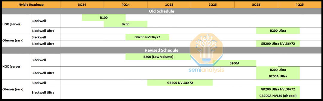 综合这两个问题来看,显然台积电将无法按照英伟达的期望供应足够的布莱克韦尔芯片。因此,英伟达几乎将其现有产能全部集中在 GB200 NVL 36×2 和 NVL72 机架规模系统上。除了最初的少量产量之外,采用 B100 和 B200 芯片的 HGX 规格产品实际上现在已被取消。