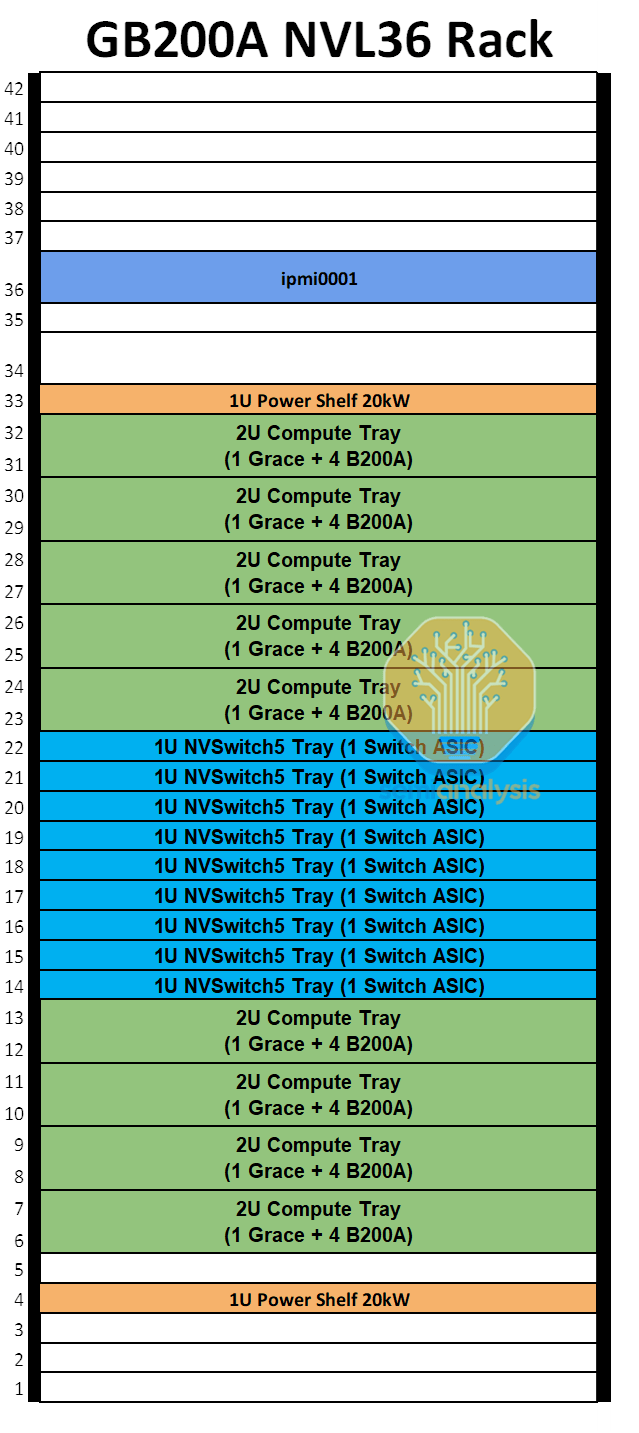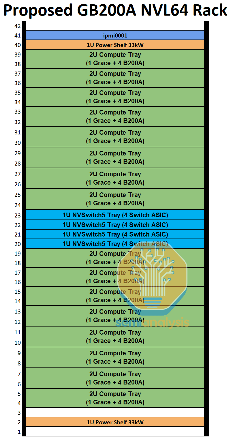 我们估计,在每个 GPU 700W 的情况下,GB200A NVL36 很可能每个机架的功率约为 40kW。2U 计算托盘需要大约 4kW 的功率,但风冷每 2U 空间需要 4kW 的散热,需要专门设计的散热器和高速风扇。