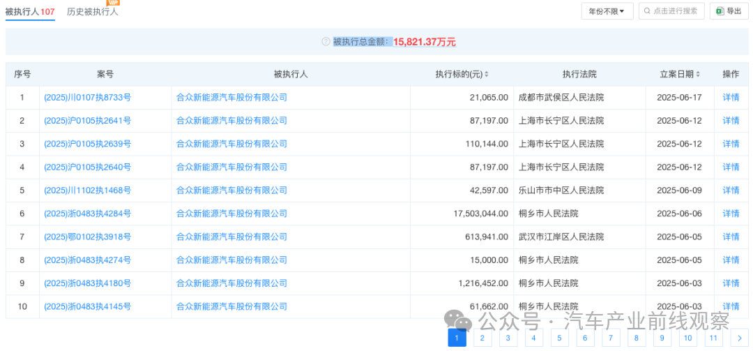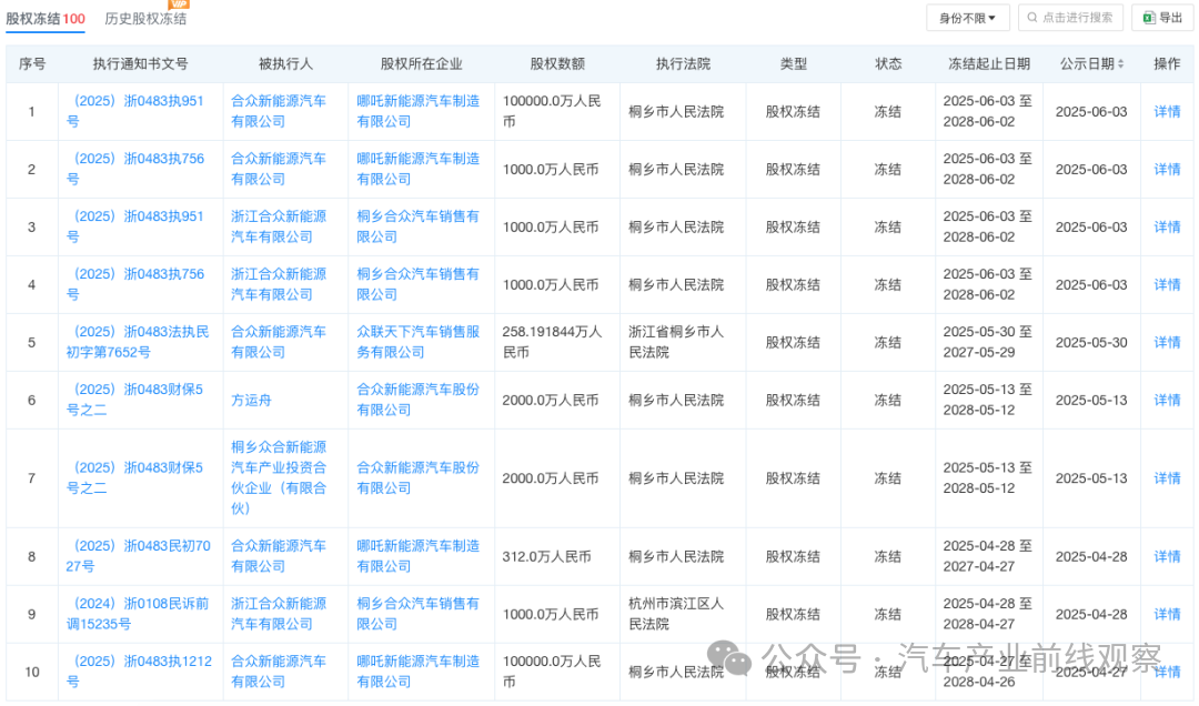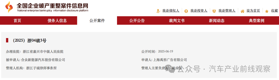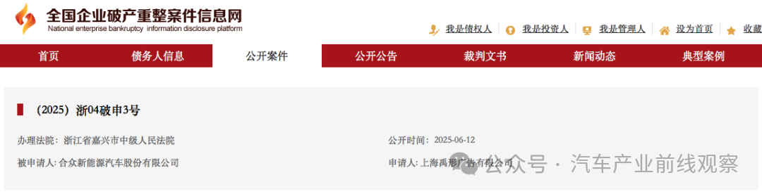 5月13日,合众新能源汽车股份有限公司新增(2025)浙04破申3号,合众新能源汽车股份有限公司被上海禹形广告有限公司申请破产重整,经办法院为浙江省嘉兴市中级人民法院。彼时,哪吒汽车方面回应称:“某广告公司向法院申请,这是这家公司应有的权力,目前我们内部没有申请破产相关事宜。不信谣,不传谣。”接近哪吒汽车的消息人士表示:“公司目前确实很困难,高层还在寻求自救。”