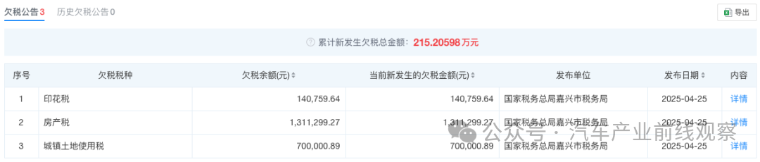 目前合众新能源汽车股份有限公司已是司法缠身。截至发稿,该公司存在107条被执行人信息,被执行总金额为15821.37万元,其中本月新增了4条;100条股权冻结信息;38条限制消费令,涉案总金额为5717.09万元。除此之外,4月25日,国家税务总局嘉兴市税务局还发布了该公司的3条欠税公告,欠税总金额为215.20598万元,欠税税种包括城镇土地使用税、印花税、房产税,税务机关为桐乡市税务局。