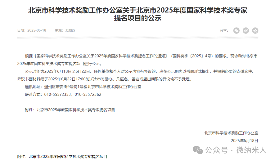 6月18日,北京市科学技术奖励工作办公室在北京市科技委官网发布了《关于北京市2025年度国家科学技术奖专家提名项目的公示》。公示时间为2025年6月18日至6月22日。
