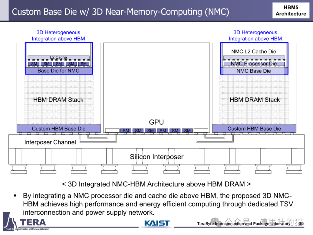 计算能力与存储架构的融合成为 HBM 路线图的革命性方向。传统存储架构中,数据在 CPU、GPU 与内存间的迁移造成巨大延迟,而 HBM 通过 "近内存计算(NMC)" 技术将计算单元直接嵌入存储堆叠。HBM5 架构中,NMC 处理器 die 与 L2 缓存 die 被集成到 HBM 上方,通过专用 TSV 互连形成 3D 异构计算单元,使矩阵运算等密集型任务无需跨芯片数据迁移,计算能效提升数倍。HBM7 更进一步引入 "双塔式 HBM-NMC" 架构,通过两堆 DRAM 与 2048 条中介层通道与 GPU 连接,构建起以存储为中心的计算架构,这种 "存储即计算" 的模式正在重塑 AI 硬件的底层逻辑。