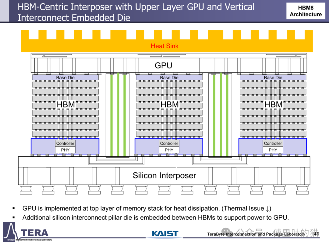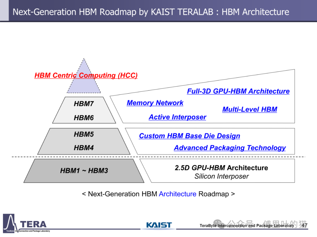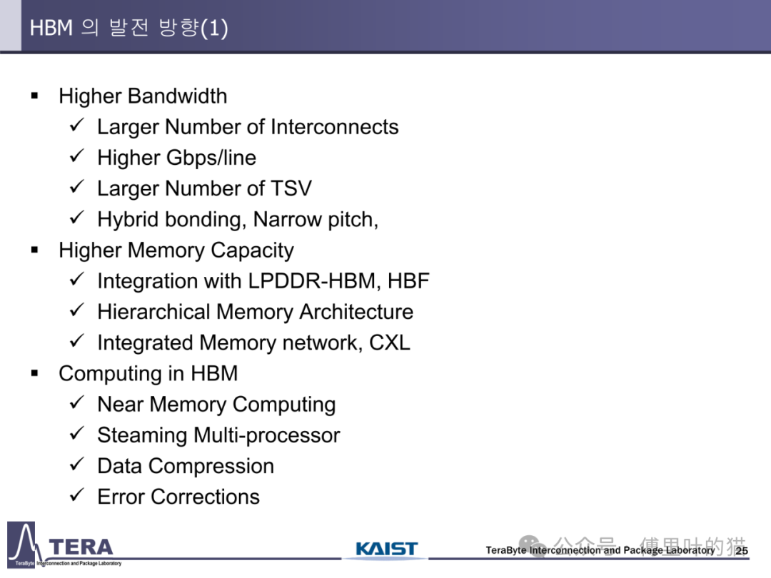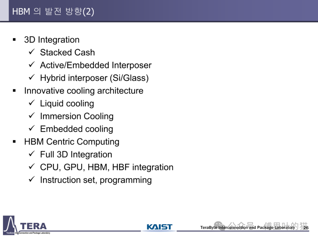 今天我们来看下KAIST TERALAB在前两天的一次workshop中公布的一些关于HBM的技术。KAIST 实验室在高带宽内存(HBM)设计技术方面处于世界领先地位,由被部分业内人士称为 “HBM 之父” 的 Kim Joungho 教授领导,在 HBM 领域有诸多开创性的研究成果。2017 年 Kim Joungho 教授首次正式公布了 Kim 法则,该法则对半导体行业的长期规划和研发目标设定起到了重要的指导作用。在前几天,该实验室举办了关于下一代 HBM 路线图的技术展示会,介绍了从 HBM4 到 HBM8 的长期路线图,涵盖 HBM 架构、冷却方法、TSV 密度、中介层等方面的进展。