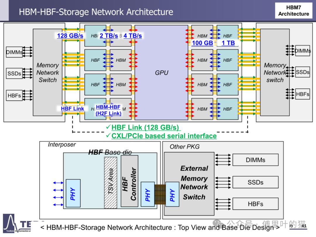 存储容量的升级与带宽增长形成协同效应。HBM1 的单颗容量仅 4/8GB,而 HBM4 通过将堆叠层数从 HBM3 的 8/12-Hi 提升至 12/16-Hi,结合 24Gb/die 的存储密度,使容量达到 36/48GB。更长远来看,HBM8 将通过 20/24-Hi 的堆叠与 80Gb/die 的密度,实现 200/240GB 的超大容量。这种容量跃升不仅依赖 DRAM 工艺进步,更得益于分层存储架构与内存网络的创新 —— 通过集成 LPDDR-HBM 与 HBF(高带宽闪存),HBM7 构建起 "内存 - 存储" 一体化网络,支持 128GB/s 的 HBF 链路与 CXL 接口,实现从内存到存储的无缝数据流转。