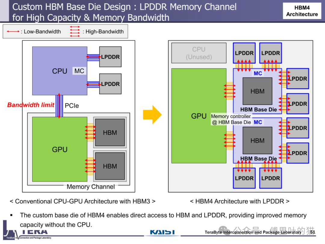 作为 HBM 技术从 3D 集成向计算存储融合过渡的关键节点,HBM4 在 KAIST TERA 实验室的路线图中扮演着承上启下的角色。这款计划于 2026 年推出的存储器,不仅在带宽、容量等性能指标上实现翻倍提升,更通过自定义基底 die 设计、HBM-LPDDR 融合架构与 AI 驱动的设计流程,重新定义了高带宽存储器的技术边界。
