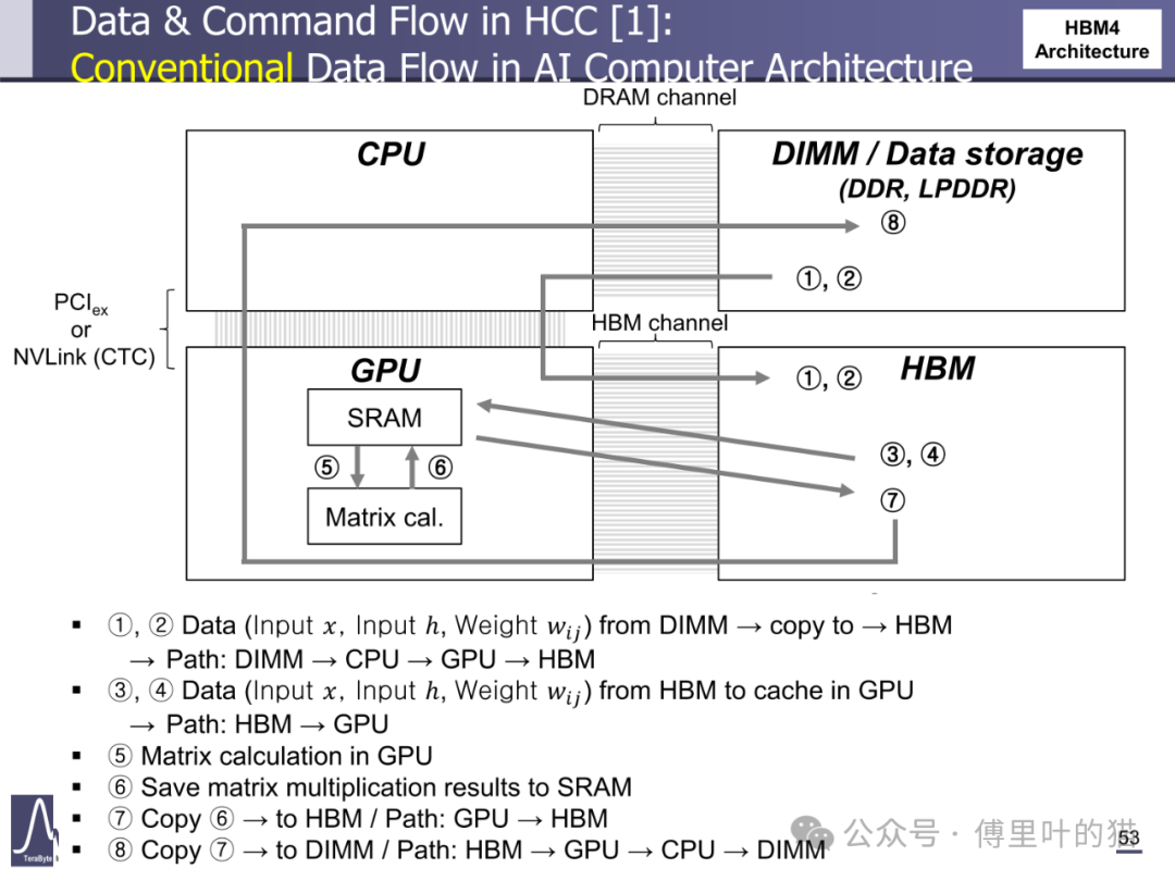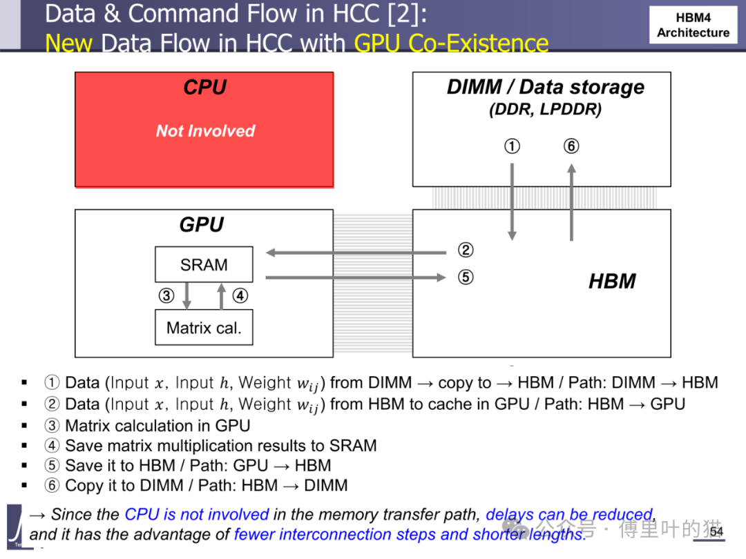 HBM Centric Computing(HCC)理念在 HBM4 中得到初步实践。HCC 架构通过优化数据流动路径,减少 CPU 在数据迁移中的参与度。在传统 AI 计算流程中,数据从 DIMM 到 HBM 需要经过 CPU 中转,涉及多次拷贝;而 HBM4 的 HCC 架构允许数据直接从 DIMM 写入 HBM,再由 GPU 直接读取,省略 CPU 参与的步骤。这种优化使数据迁移延迟降低 40%,尤其适合大型 AI 模型的训练场景 —— 在矩阵运算中,数据从 HBM 到 GPU 缓存的路径缩短,配合 NMC 处理器在基底 die 中完成的数据预处理,使整体计算效率提升 25% 以上。