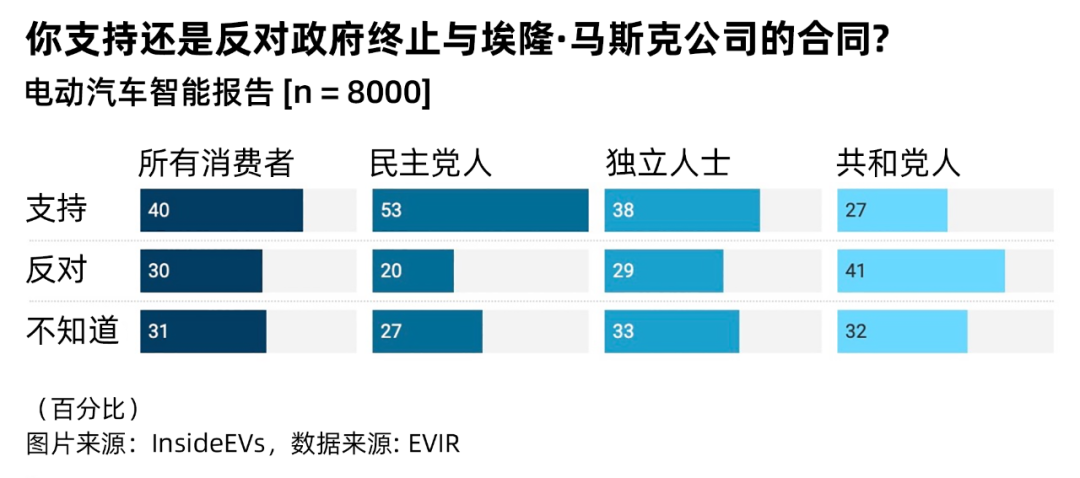 但他的“清洁能源倡导”似乎并未挽回消费者对特斯拉的态度。EVIR研究调查指出:“民主党选民对特斯拉的看法非常负面,独立选民同样如此,而共和党人对特斯拉的好感度也没有出现足以抵消损失的实质性提升。”