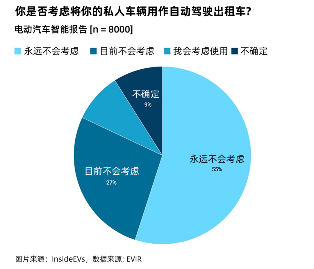 55%的消费者表示,他们绝不会让自己的私家车被用作自动驾驶出租车。约27%的消费者表示,他们“目前”没有考虑过这样的情况。约9%的消费者表示不确定,另有9%的消费者表示,他们会考虑在不使用私家车时,让其充当自动驾驶出租车。这些数字对特斯拉来说也并非利好消息,因为马斯克已将公司的未来押注于自动驾驶技术。如果自动驾驶技术不能大幅推动需求飙升,特斯拉可能将别无选择。
