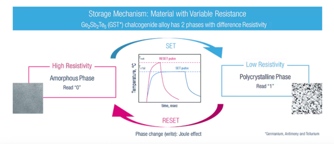 ST在官网中也对PCM的工作原理进行了介绍,PCM采用锗锑碲 (GST) 合金制造而成,其在制造过程中利用了材料可在非晶态和结晶态之间进行快速热控制变化的物理特性。上述状态分别与逻辑0和逻辑1相对应,可通过非晶态(逻辑0)的高电阻和结晶态(逻辑1)的低电阻进行电气区分。PCM支持在低电压下进行读写操作,且与Flash和其他嵌入式存储器技术相比,具有多项实质性的优势。