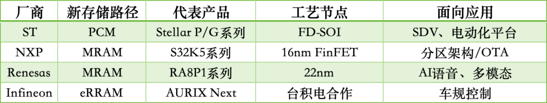 2025年,仅半年时间内,ST、恩智浦、瑞萨等头部MCU厂商几乎同时发布搭载新型嵌入式存储(如PCM、MRAM)的汽车MCU产品,打破了MCU长期以来以嵌入式Flash为主的技术格局。虽然谈“标配”仍为时尚早,但可以肯定的是:新型存储已经从“尝试”跃升为“战略布局”,并开始对MCU生态产生深远影响。