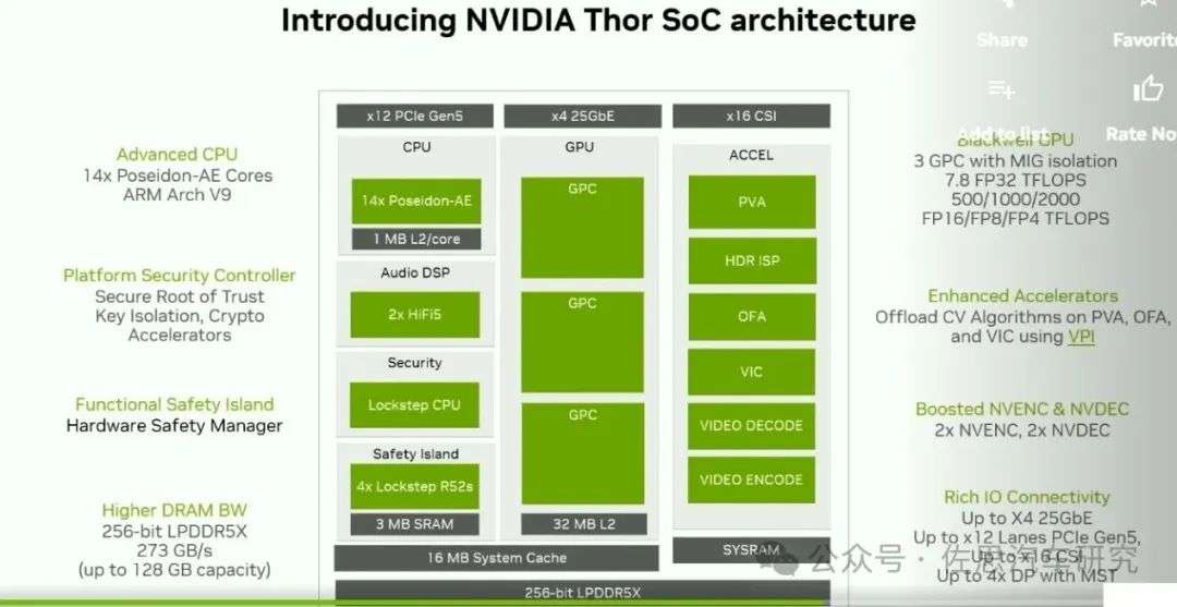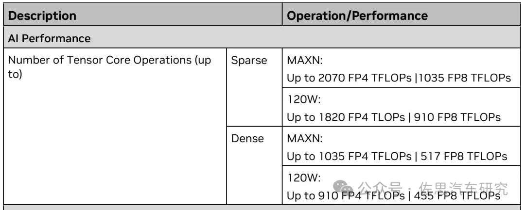 与Orin相比,Thor取消了DLA,并且低精度AI运算完全由张量核心负责,GPU则负责高精度运算,分工明确,实际算力值就是理想算力值。不像上一代的Orin,AI算力由CUDA核心、张量核心和DLA三者相加。FP4精度下稀疏算力2070TFLOPs,由于transformer架构更适合浮点,所以英伟达这里只点出浮点计算算力,当然,浮点支持是比整数INT难度要高的。