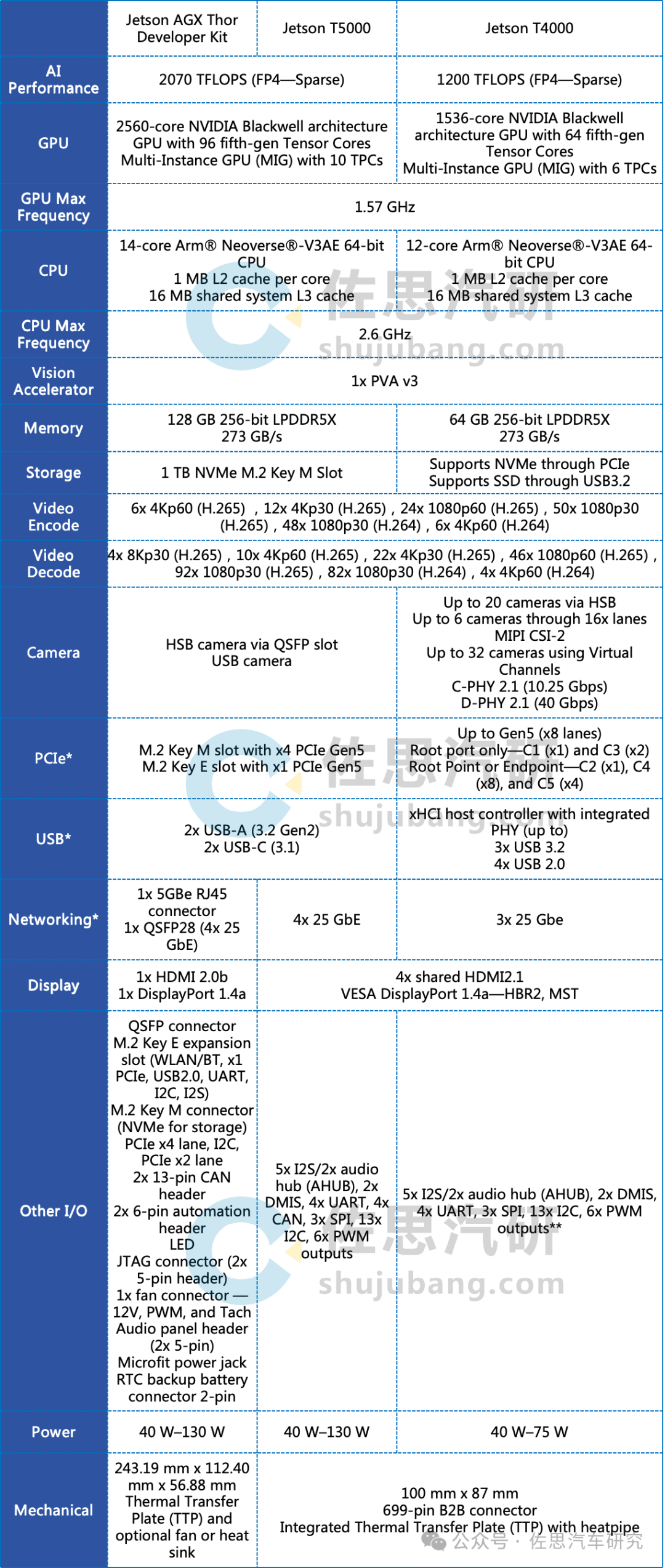 英伟达Jetson Thor系列产品即将正式发售,英伟达官网放出了产品参数,目前有三个产品,包括一个是完整的开发套件,即AGX Thor Developer Kit,另外两个则是一片模组,高算力模组型号是T5000,低算力型号是T4000。目前还未公布价格,笔者推测AGX Thor Developer Kit价格在2999-3299美元之间,T5000价格是2299-2599美元,T4000价格是1999-2199美元。这三款产品目标市场都是具身智能和物理AI。T5000近似汽车领域的Thor-X,T4000近似汽车领域的Thor-U。