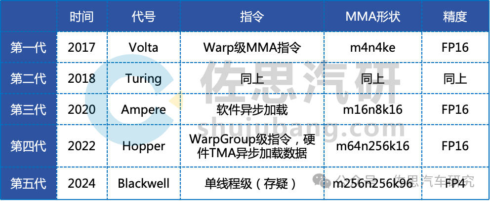 用MMA可以简单计算算力值,如Blackwell在FP4精度下,每周期的浮点算力是256*256*96,每条PTX指令,可以同时完成乘积和累加,即2OPs,即256*256*96*2=12582912,英伟达张量核心运行频率大致在1.3-1.7GHz之间,96个张量核心即48个SM单元,算力即为48*1.7GHz*12.582912=1026.7TOPS,与英伟达官方的1030TOPS非常接近。比第一代张量核心算力提高了几百倍。