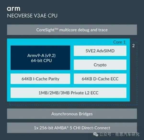 Thor使用ARM的V3AE架构,AE代表特别针对汽车,指令L1缓存64KB,数据L1缓存为64KB,L2缓存最高支持3MB,Thor选择了1MB,L3缓存是16MB。顶配Thor-X为14核心,次顶配Thor-U为12核心。CPU最高运行频率是2.6GHz。