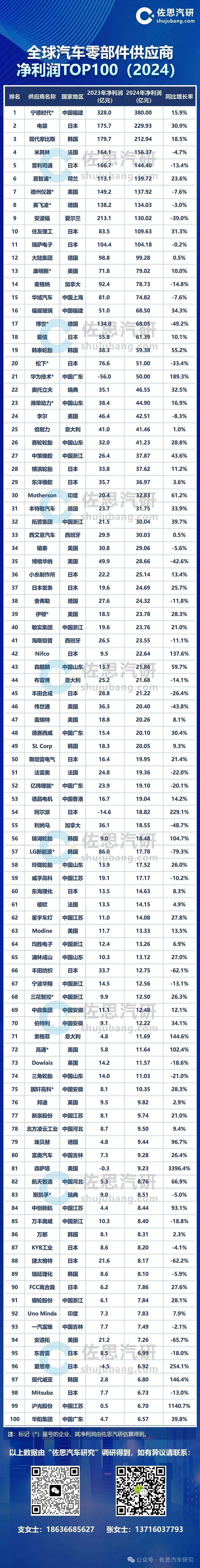 2024年国内外汽车零部件供应商净利润TOP100