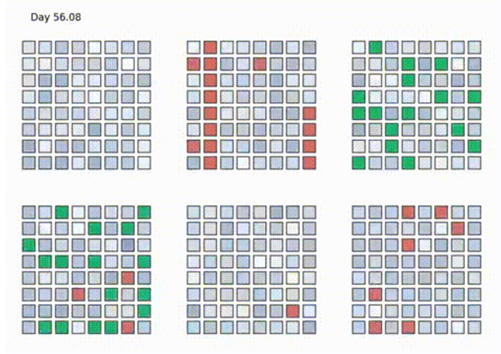 这就是PaLM的训练方式。它花了56天在6144个TPUv4(2个pod)上训练。下面你可以看到6个pod上的TPU作业分配:绿色是PaLM,红色是无分配,其余是其他作业。注意每个方块是4x4x4 TPU立方体。