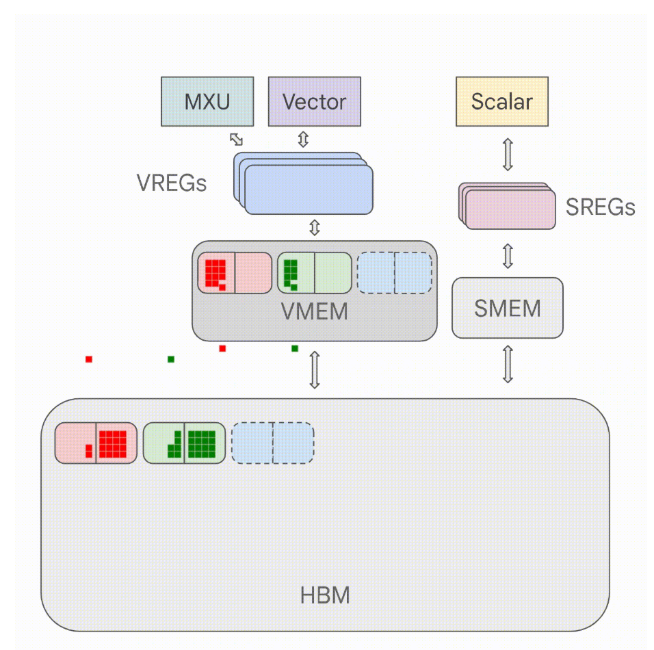 注释:这就像是工作台上的临时储物盒,数据从大仓库(HBM)搬到工作台附近的小盒子(VMEM)里,方便快速取用。