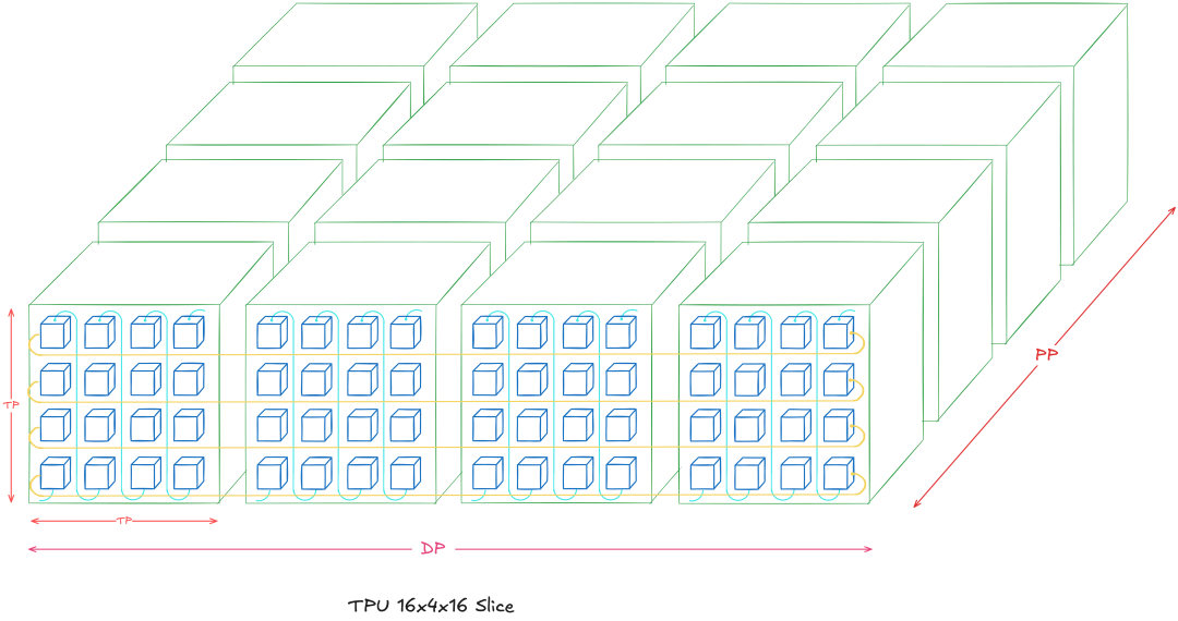 注意扭曲环面限于每个DP模型的每个TP维度(即给定k=1…16的每个z=k的4x4 2D平面)。DP维度只有环绕,使每行成为大小为16的水平环。