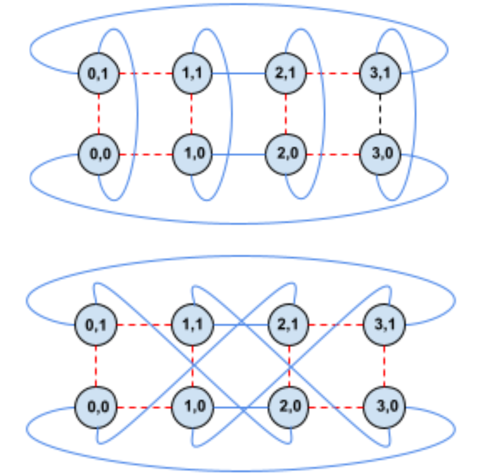 注:实际上,当芯片数量大于4x4时,扭曲环面带来好处。我们使用4x4只是为了可视化目的。