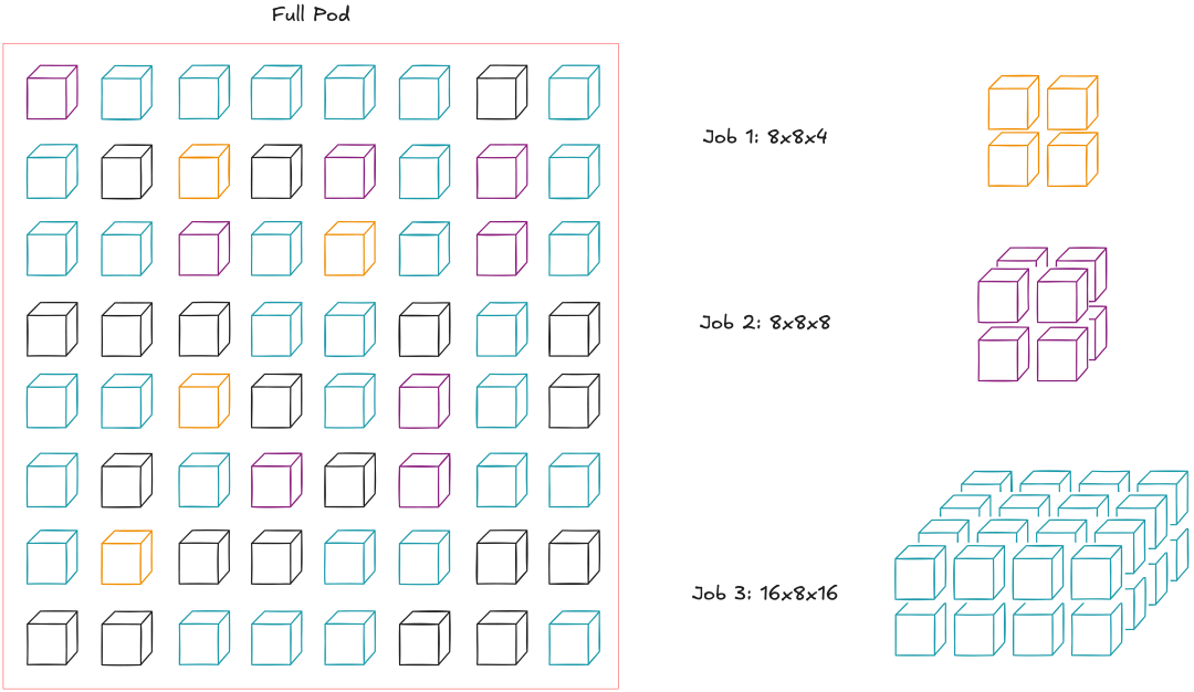 注释:这意味着不同的AI任务可以使用pod中不相邻的芯片,就像在停车场中,你可以使用任意位置的停车位,而不必使用连续的位置。这大大提高了资源利用率。
