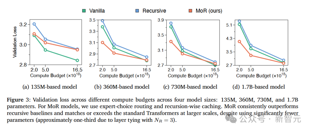 如图3所示,在所有参数规模和算预算力下,MoR始终优于递归基线模型。