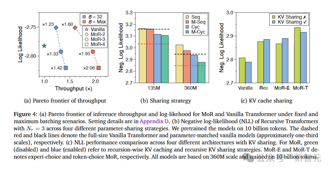 针对MoR模型,研究人员提出了两种KV缓存策略:按递归层缓存和跨递归共享。