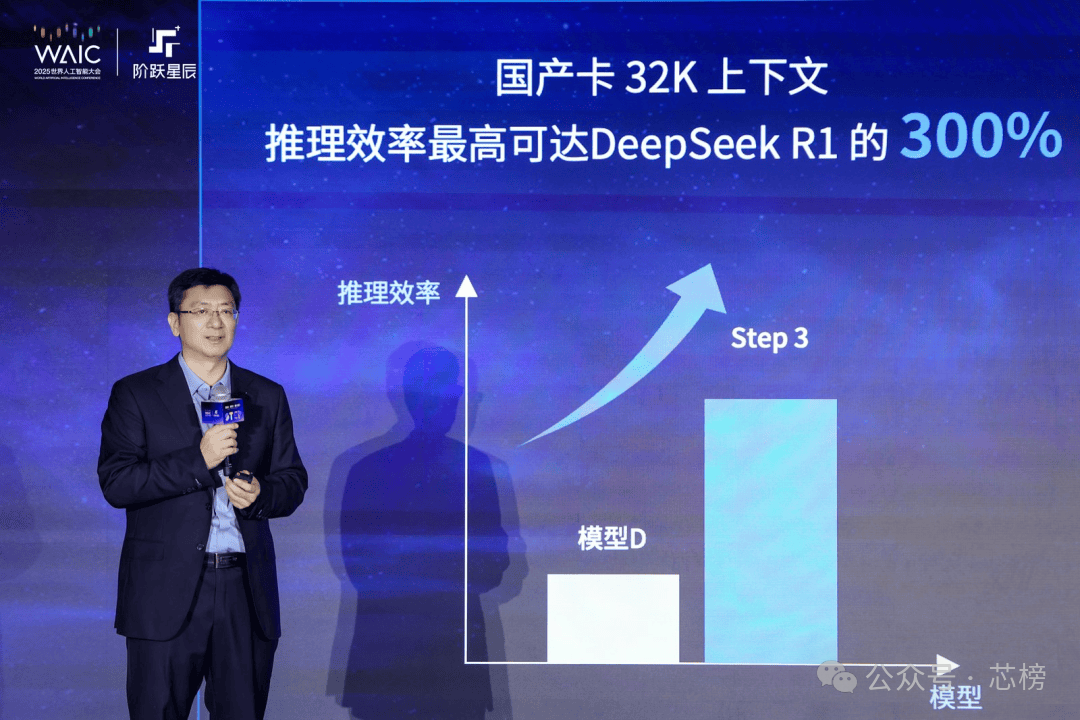 此次同台的核心契机,是阶跃星辰发布的新一代基础大模型 Step 3 带来的行业突破 —— 该模型通过系统和架构创新,在国产芯片上的推理解码效率最高可达 DeepSeek-R1 的 300%,且对各类芯片兼容性优异,为大模型与算力的双向价值释放提供了新可能,也让芯片与模型厂商的联合创新成为焦点。