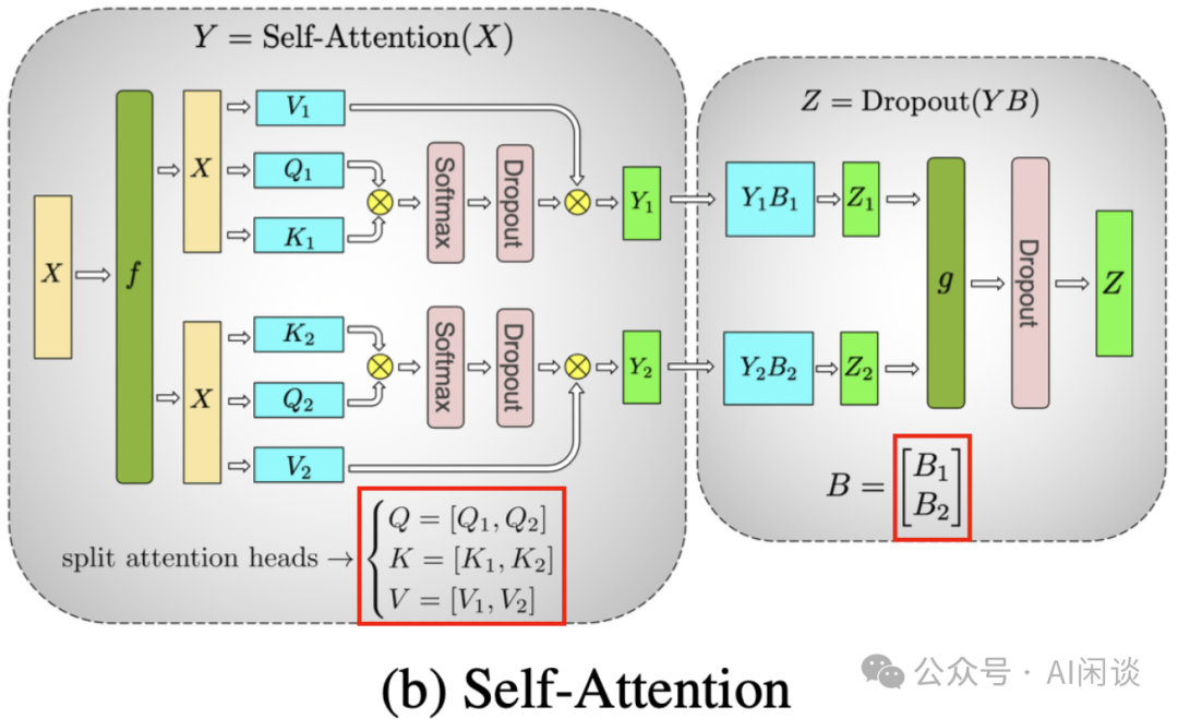 如下图(b)所示,由于每个 Head 的 Attention,Softmax 都是独立的,因此可以采用按照 Head 的方式切分(等价于 Column Parallelism),然后对之后的 FC 采用行切分(B,Row Parallelism),这样 Self-Attention 中间也不用通信: