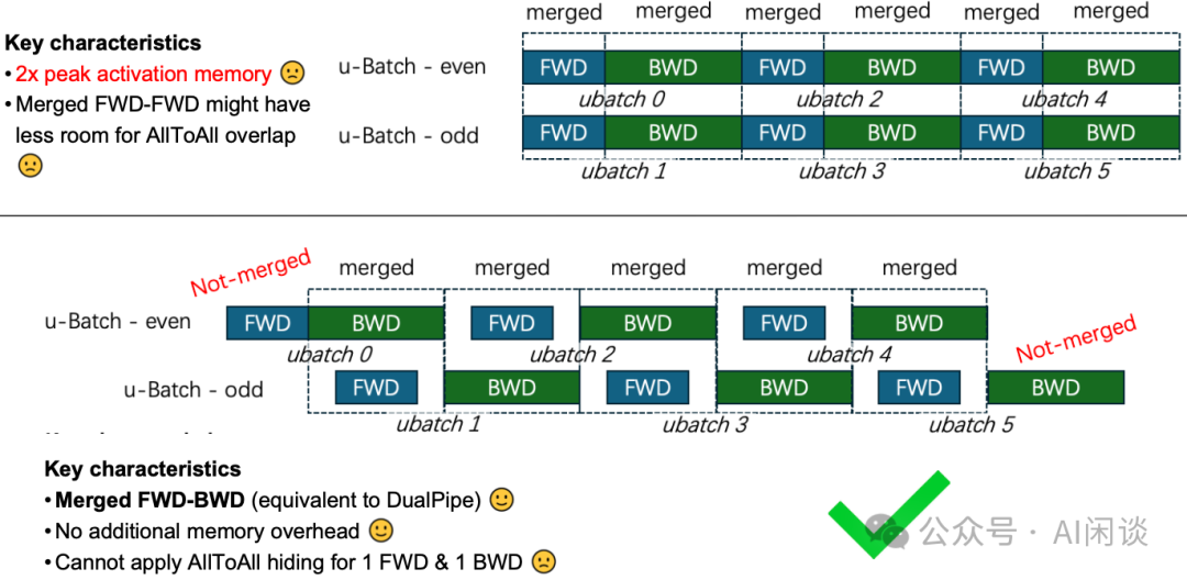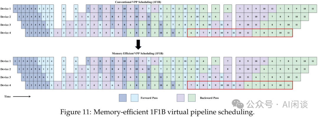 VPP 优化:至于 PP 方案,当梯度累积比较少时,比如小于 PP-Degree 时,采用 1F1B;当梯度累积比较大时,采用 VPP(Interleaved 1F1B)。考虑到最后一个 PP Stage 还包含损失函数相关计算,也会占用较高内存,因此对其进行优化,一旦最后一个 PP Stage 的 Forward 完成,立即启动 Backward 计算并释放损失函数的激活内存,这样最后一个 PP Stage 最多只保留单个 VPP 阶段的激活内存。如下图 Figure 11 中的红框所示。