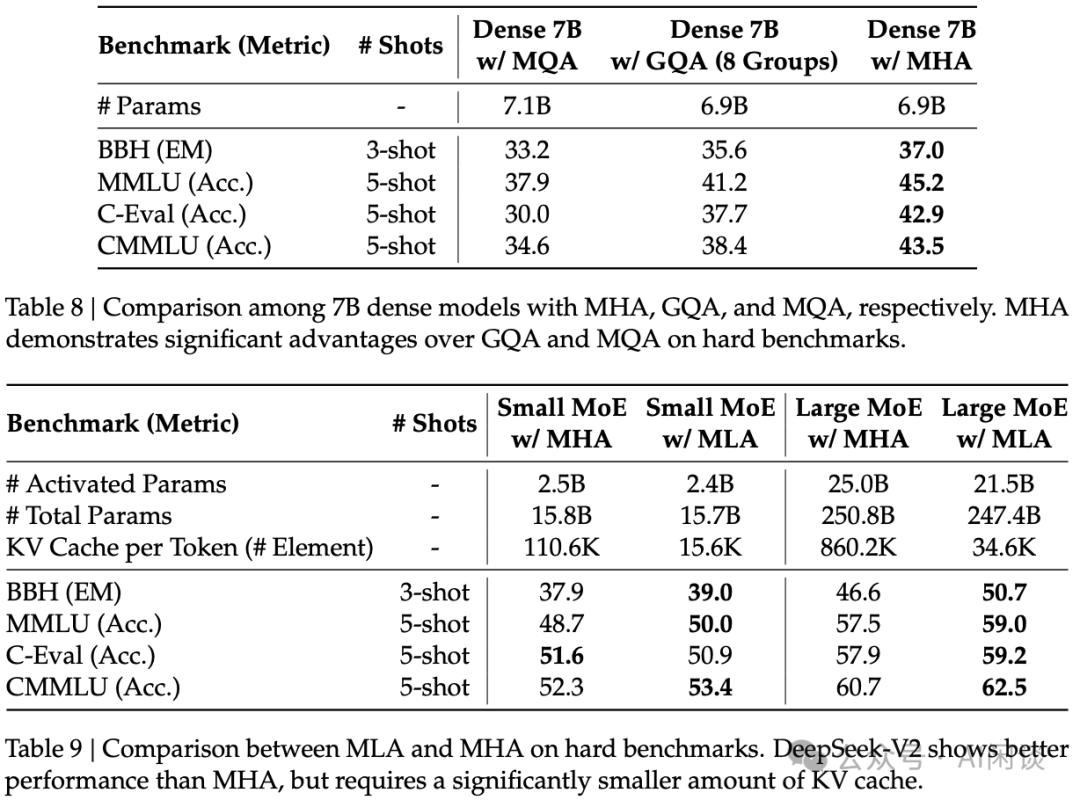 如下图 Table 8 和 Table 9 所示,DeepSeek 团队在 DeepSeek V2 的技术报告中进行过一些消融实验,MLA 的效果优于 GQA,甚至优于 MHA: