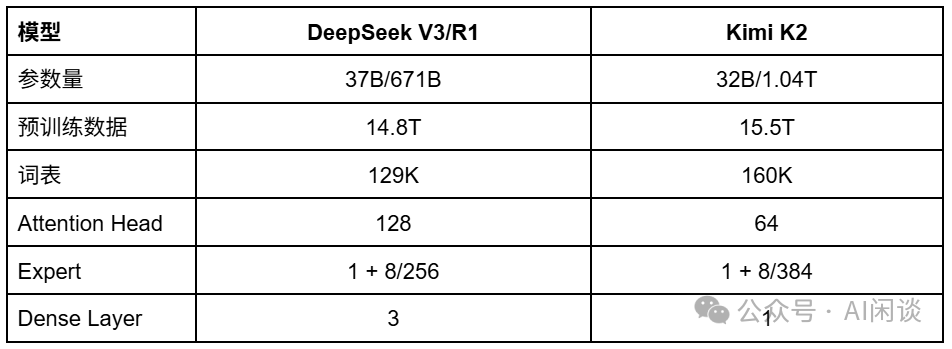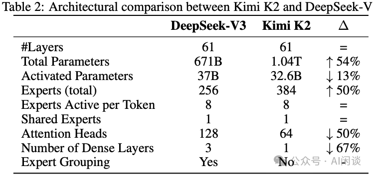 Kimi K2 参数量更大,但是激活更少,主要是因为 MoE 部分共享专家增多,但是激活专家并没有增加;同时 Attention Head 减半,因此总的激活参数反而降低。
