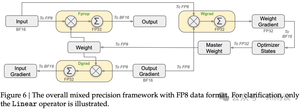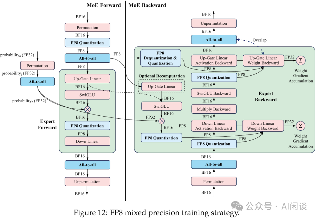 对于 Up-gate Linear,保留其 FP8 输入激活值 XFP8 而非 BF16 张量 XBF16 用于 Backward。在 Backward 中,需要利用转置后 XBF16 的 FP8 量化版本来计算权重梯度。因此,在权重梯度计算阶段,需要对 XFP8 执行反量化-转置-再量化操作。该策略可降低 Up-gate Linear 的内存占用,并使得第一个 All2All 操作使用 FP8 精度执行以节约通信开销。这是内存占用、通信成本与计算精度之间的权衡方案,实验表明该方法能保持与基线实现相同的收敛速率。