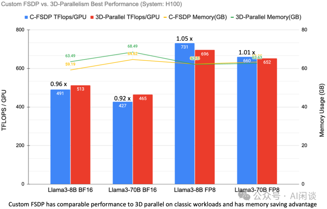 3.2.3 PyTorch FSDP 与 DeepSpeed 的 ZeRO 优化方案类似,Meta 也提供了 PyTorch 原生支持的 FSDP V1([2304.11277] PyTorch FSDP: Experiences on Scaling Fully Sharded Data Parallel)和 FSDP V2([2411.00284] SimpleFSDP: Simpler Fully Sharded Data Parallel with torch.compile) 方案。早期的 Megatron-LM 框架不支持 FSDP,限制了 FSDP 的发展,最近半年 NVIDIA 在 Megatron-Core 里实现了相应的能力并进行了一系列优化,也能获得很不错的吞吐。随着后续集群 Scale-Up 域的扩展(比如 NVL72),FSDP 也许会有更大的空间。